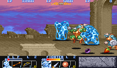 The King of Dragons features a RPG level advancement system that allows character attributes to be upgraded as players progress through the game. Points scored for killing monsters and picking up gold count towards experience, and the character gains levels at regular intervals. With each level, the character's health bar increases, other attributes such as range improve, and the character also becomes invulnerable for a few seconds. Along the way, different weapon and armour upgrades may also be picked up.
