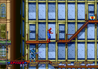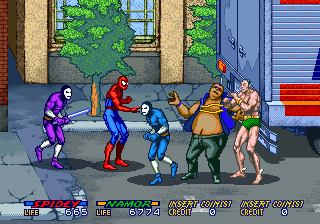 Spider-Man: The Videogame is split into two playing styles. The start of each chapter has the game playing as a Beat-em-up scrolling from left to right with only your fists and feet being used to stop the various goons who attempt to drain you energy and kill you. Halfway across the chapter after beating a supervillain or two the screen zooms out turning the game into a platform game with the screen scrolling in four directions. You are now also able to use your weapons and other powers you possess. Each character also can use Mutant power but use it wisely as it drains part of your energy. Four people can play at the same time but each character can only be used once. |
