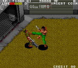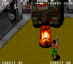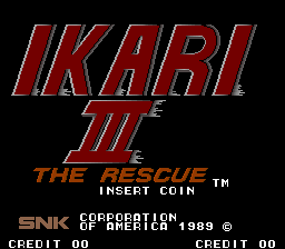 The presidential candidate's daughter has been kidnapped! It is your job to get past enemy lines and rescue her. This is the third game in the Ikari Warriors series, and features similar arcade/action gameplay. The screen is a top down view which scrolls vertically, with numerous bad guys to defeat. You start the game with just your fists, and as the levels progress you can find weapons and other objects to help you out.