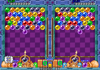 A two-player mode is included as well. Each player competes on an area occupying half of the screen, dealing with identically generated bubbles. Whenever a player successfully disposes of a bubble group, a part of it is transferred onto the opponent's part of the screen.