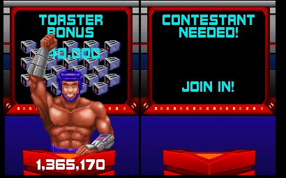Smash T.V. is an insane shoot-em-up from the brain of Eugene Jarvis, creator of Robotron: 2084. It retains that game's frantic style of play and two-joystick control method, but adds plenty of gore, violence, a hint of satire and that all-important two player mode. |