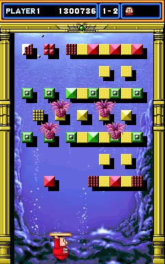 A Breakout type game with characters such as Mr. Chin and the Thunder Warrior. Mr. Chin holds a stick over his head that acts as the paddle. If your ball hits one of the power-up carriers (flying saucer, submarine, or airplane) you have to try and pick up the released power-up while continuing to keep the ball in play.
