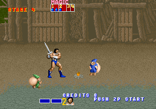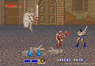 This is a horizontal fighting game, where you basically take one of the three characters (the barbarian Ax Battler, a dwarf named Gilius Thunderhead or the amazon Tyris Flare) and bash everything which stands between you and Death Adder himself. Each character has a special magical ability that can be charged by kicking small blue creatures that drop a potion. There is also a green variety off this creature that drops food that replenishes your health. Some enemies ride dragons and a scorpion like creature. The enemies can be knocked off and you can mount the creature yourself and attack the enemies with it. |