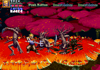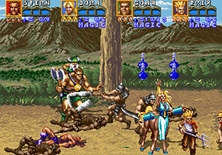 Death Adder is back - and the heroes must stop him. You choose your own hero from 4 characters: Goah the giant (Gilius Thunderhead from the first game rides on him), Stern the barbarian, Dora the Kentauride, and the elf Little Trix. You go from left to right, beat up various opponents with melee attacks, and use magic spells. |
