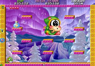In Bubble Symphony, you play one of four dragons - Bubblun, Bobblun, Kululun, and Cororon. Each dragon has its advantages and disadvantages. You have the task of trapping your enemies in bubbles, then bumping into them to make them turn into food, which you can get for points. There are multiple paths that you can take, and bosses that you have to defeat in order to proceed to the next set of levels. Multiple endings are viewed depending on skill and secrets found. Features an excellent soundtrack and guest appearances from various Taito games. |