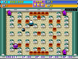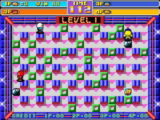 New Atomic Punk: Global Quest (Bomber Man World in Japan) is part of the Bomberman series and the direct sequel to Irem's earlier arcade version. The game is very similar to other games in the series - the player controls Bomberman and must destroy all enemies on a level, using bombs. There are power-ups to collect that increase firepower or allow more bombs to be set. Unlike in other games of the series, the player doesn't have to find the exit - when all enemies are destroyed he automatically goes to the next stage. There are 36 stages in Normal Mode (six worlds with six levels each).