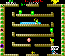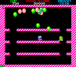 Bubble Bobble is a platform game, with each level being a single screen. The enemies must be cleared from a level to go to the next one. With one player controlling Bub and the other controlling Bob, the player can jump and collect items for points (such as fruit). The real power Bub and Bob have however is the ability to blow bubbles. These bubbles can be as platforms to leap on, or to trap enemies. Enemies trapped in a bubble must be popped by jumping into them, wherein they'll turn to fruit. Additionally, power-ups sometimes float by in bubbles. They include lightning, which flies out horizontally at enemies, and water, which drags the player and enemies straight down flowing over platforms. Taking too long to complete any level will summon Baron Von Blubba, who will float around the screen trying to destroy the player.