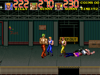 This is the third game in the series although there is little if any resemblence to the previous two titles. Players can choose to play Billy, Jimmy or Sonny who journey and fight throughout America, China, Japan, Italy and Egypt in search of the three Rosetta Stones. There are shops on each level that allow the player to purchase power-ups for depositing additional credits.